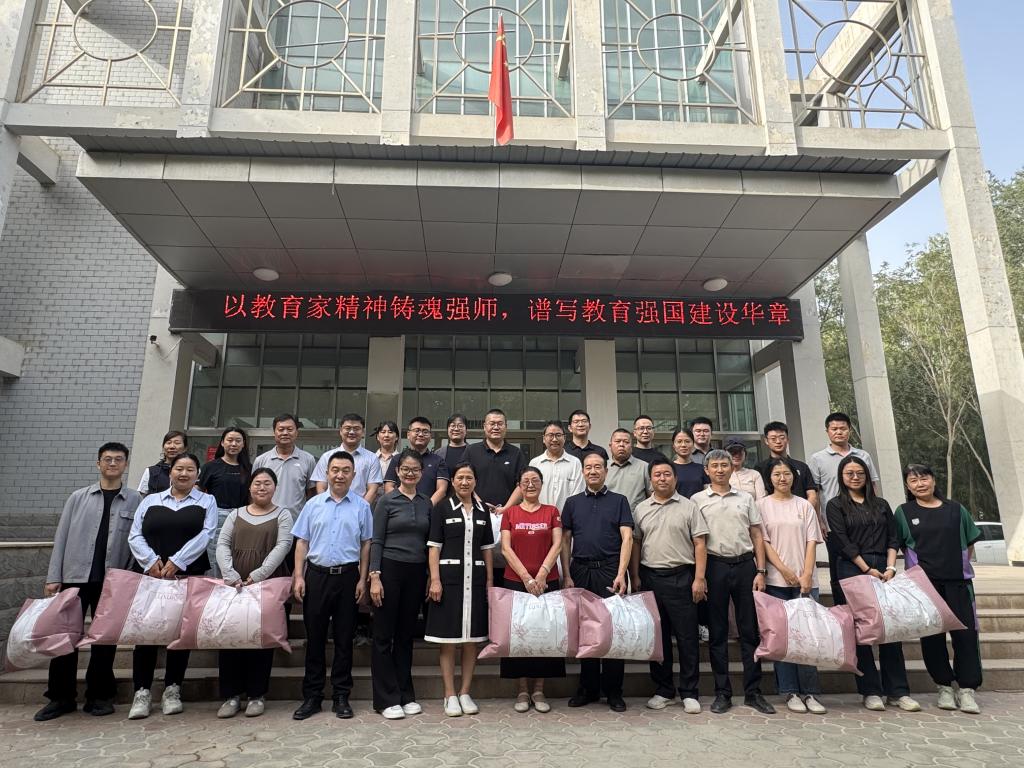 会后学院向银龄教师、新入职教师发放慰问品并合影留念。
