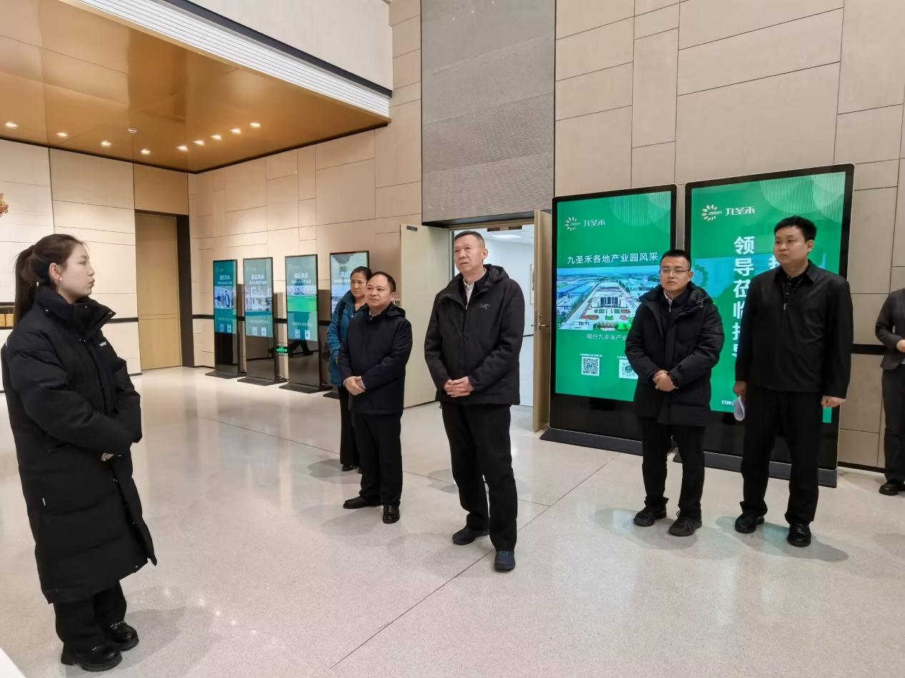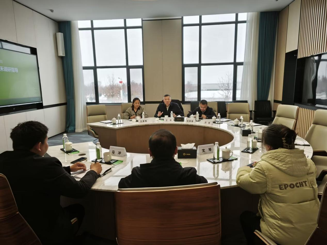 于军一行来到昌吉市九圣禾控股集团有限公司,了解企业发展历程与成果,并与该公司总裁姚鑫、人力资源管理中心总经理马冲、员工文琴进行座谈交流。座谈会上,于军介绍了学校发展情况与人才培养情况,并认真听取了企业的用人需求与合作建议。