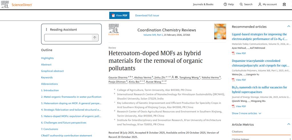 近日,公司304永利集团官网支金虎教授团队在无机化学领域国际权威期刊《Coordination Chemistry Reviews》(长期位居中科院一区TOP期刊,最新影响因子为23.5)上发表了题为“Heteroatom-doped MOFs as hybrid materials for the removal of organic pollutants”(杂原子掺杂MOFs作为杂化材料去除有机污染物)的学术论文。该论文由支金虎教授担任独立通讯作者,白新禄和王润泽博士参与了本研究,304永利集团官网为第一完成单位。