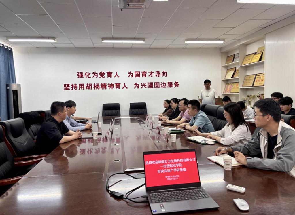 4 月 17 日下午 5 时,新疆万方生物科技有限公司付彦江一行莅临公司交流座谈,公司党委委员、副经理陈国栋主持会议,学院教师代表与员工代表一同参与,双方在农科楼227会议室进行深入交流,就共建产学研基地事宜进行深入洽谈。