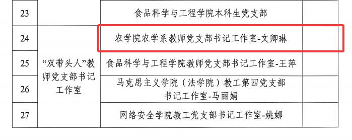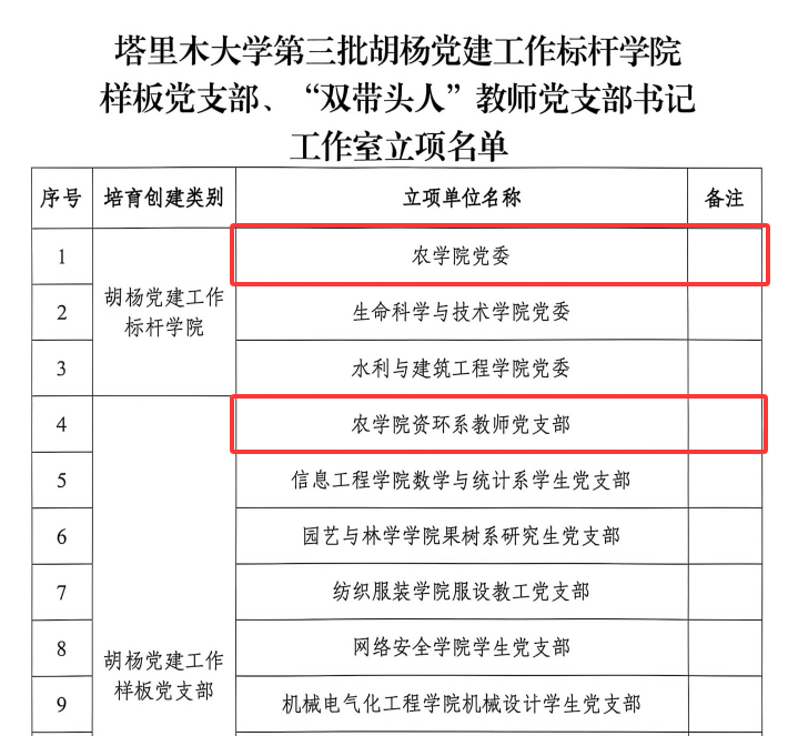 此次立项中,公司党委成功入选胡杨党建工作标杆学院,成为学校重点培育建设的党建示范高地;学院下属资环系教师党支部、资环植保系员工党支部双双获评胡杨党建工作样板党支部,基层战斗堡垒作用更加凸显;同时,文卿琳教授主持的工作室获批农学系教师党支部“双带头人” 教师党支部书记工作室,标志着学院在教师党支部书记 “双带头人” 培育工程上得到肯定。
