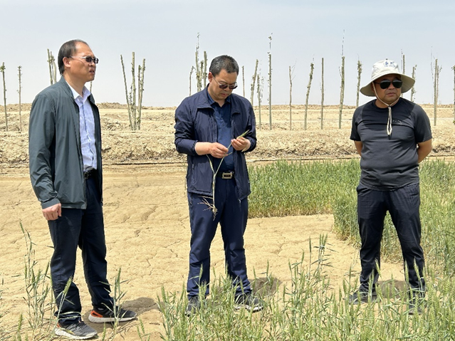 专家一行实地调研了园区盐碱地改良效果,查看冬小麦长势,就7000亩冬小麦抽穗扬花、灌浆期的肥料施用和“一喷三防”,对1000亩飞播水稻田的出苗、灌水现状及后续工作进行了详细交流指导。重点针对小麦收获复播耐盐油葵、油菜、大豆等作物增加土壤有机质,改良土壤的盐碱措施,进行了详细讲解。