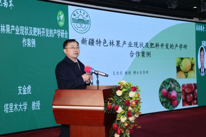 支金虎教授作了题为《新疆特色林果产业现状及肥料开发的产学研合作案例》的报告。
