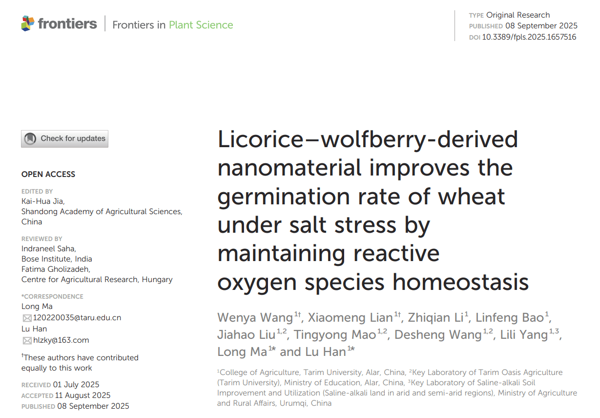 翟云龙教授团队的系列成果验证了农业纳米材料在南疆粮油作物生产中的应用潜力,并揭示了其中生理机制。其中,304永利集团官网2022级本科生连晓梦同学以第一作者在《Frontiers in Plant Science》(中科院二区TOP)发表论文1篇。