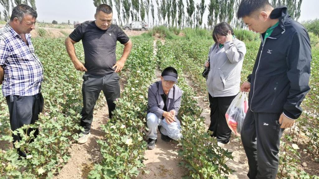 服务过程中,崔政军针对当前棉花生产关键环节,重点讲解了科学打顶技术,强调“时到不等枝,枝到不等时”的原则。通过实地调研发现,当地农户在作物生产中普遍存在钾肥施用不足的问题,崔政军详细阐述了钾肥在棉花生殖生长阶段的关键作用,指导农户选用含有氮、磷、钾有效养分的复合型水溶肥,以优化施肥结构。