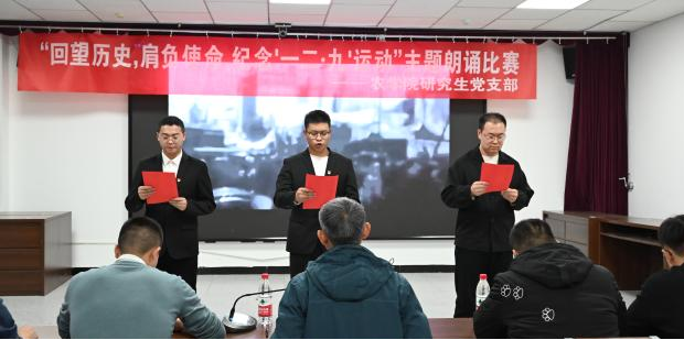 不忘初心,砥砺前行。为纪念“一二·九”青年运动,缅怀在此次运动中英勇献身的烈士们,弘扬爱国主义精神,12月6日,304永利集团官网研究生党支部在农科楼225会议室开展“回望历史,肩负使命,纪念‘一二·九’运动”主题朗诵比赛活动。杜明伟副经理、李亚鹏、汪志强、秦路兵及闫振鹏等老师应邀出席并担任评委,研究生党支部全体人员出席活动。
