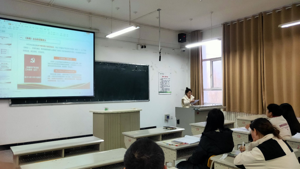 王婷婷以“《中国共产党支部工作条例(试行)》的解读”为题,围绕《条例》提出的背景及意义,对党支部的核心功能与职责进行了深刻阐述,并从党支部建设的重要性和基础性对《条例》的重点、要点进行了全方位、多层次、有条理的解读。她指出,《条例》是新时代加强党的基层组织建设的重要法规,对于推动全面从严治党向基层延伸、提升党支部工作水平具有深远意义。