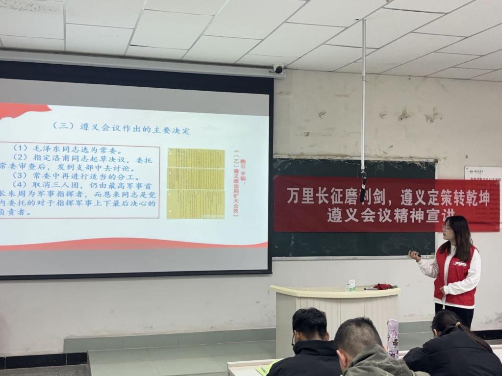 宣讲中,黄玺霏同学从遵义会议的基本过程和历史意义、遵义会议精神的主要内涵和重要启示、弘扬遵义会议精神走好新的长征路三个角度进行系统深入地讲解,让广大青年学子更加了解遵义会议的历程,培养其爱国主义情怀。在宣讲过程中,大家听得认真、记得仔细,纷纷表示深刻感受到了革命先辈们为了党和人民的事业,勇于担当、敢于拼搏的革命精神。