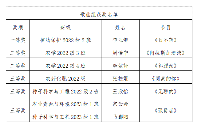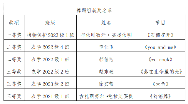 歌声在这里回荡,青春在这里绽放。来自植物保护2022级2班的选手李亚娜演唱的《日不落》获得歌曲组一等奖,她用深情的嗓音表达了对学院、学校永恒真挚的爱;来自植物保护2023级1班的选手布依则孜汗·买提依明表演的舞蹈《石榴花开》获得舞蹈组一等奖,她用优美的舞姿演绎出民族团结一家亲的画面。17名参赛选手出彩的表演让观众在视觉和听觉上都得到了充分的享受。观众们掌声如潮,热烈的气氛贯穿于参赛者和观众之间,形成了良好的互动。