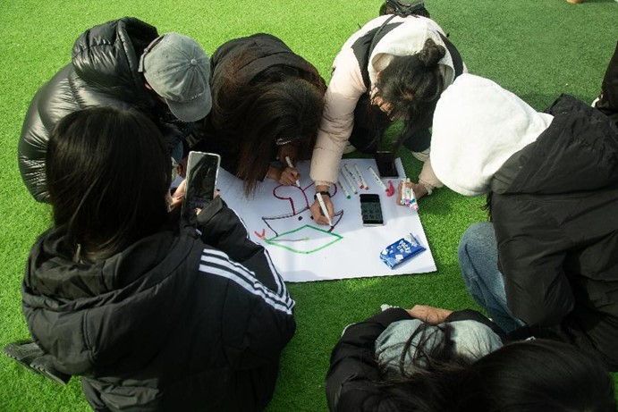 活动首先利用塔大地标拼图将所有成员分为四队。随后“白纸画旗”活动,通过各队伍团结协作设计队旗与队名的方式,提升队员的凝聚力,热烈的讨论声将气氛活跃到了高潮。