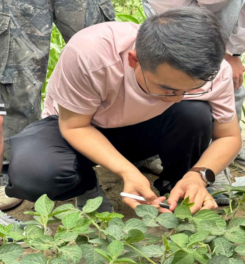 上午12点,我们齐聚农学实验站的玉米大豆种植区。赵国龙手持镊子,在大豆植株前演示关键步骤:“大豆是闭花授粉作物,去雄必须在下午四点后进行,此时花蕾尚未开放,能避免自花授粉。”他找到具有目标性状的父本和母本,在大豆开花前用镊子小心剥开花蕾去除母本未成熟的雄蕊,采集父本当天开放成熟花朵的雄蕊,用镊子将其放置在母本雌蕊柱头上,随后套袋隔离并标记信息,后期观察果实发育收获种子。