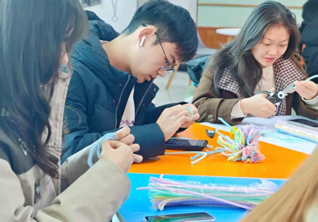 2025年12月14日下午,学院心理健康部组织的以“协作与成长”为主题的第三次团辅活动在东区17号员工公寓楼一楼大厅“良耜家园”新农人共享交流区顺利开展,活动以趣味扭扭棒创作为载体,带领员工在弯折、拼接的手工过程中梳理心绪、舒缓焦虑,百变的造型激发无限灵感,吸引大批学子热情参与,现场氛围活泼又治愈,创意与暖意交织绽放。