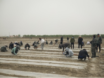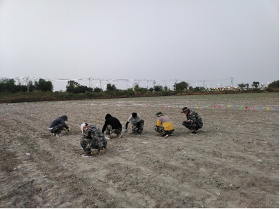 东区胡杨林试验基地共计148亩,主要种植的农作物有棉花,大豆,玉米,高粱,孜然等,播种主要有大田机播和试验小区人工点播两种方式。在农学系老师的带领下,师生来到田间地头,分工协作,拾取残膜,拉线布设小区、地膜打孔、扫除膜上覆土、播下种子、覆土盖种,每个环节都井然有序,有条不紊。虽然当天有些风沙浮沉,但依然阻挡不了大家春耕的热情,现场一派热火朝天的景象。