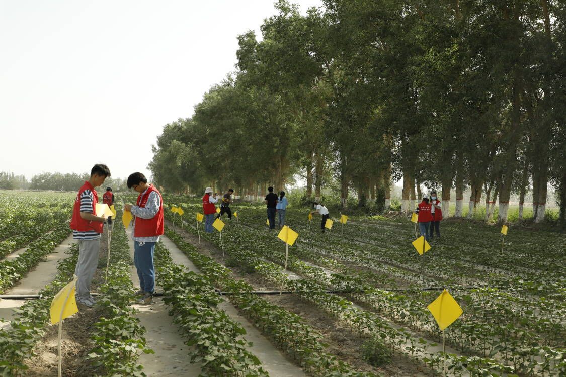 宣讲结束后,团队成员深入棉田进行实际操作,理论结合实践,让棉农更好的了解棉田苗期蕾期管理技术要点,并示范正确地悬挂棉蚜板方法。